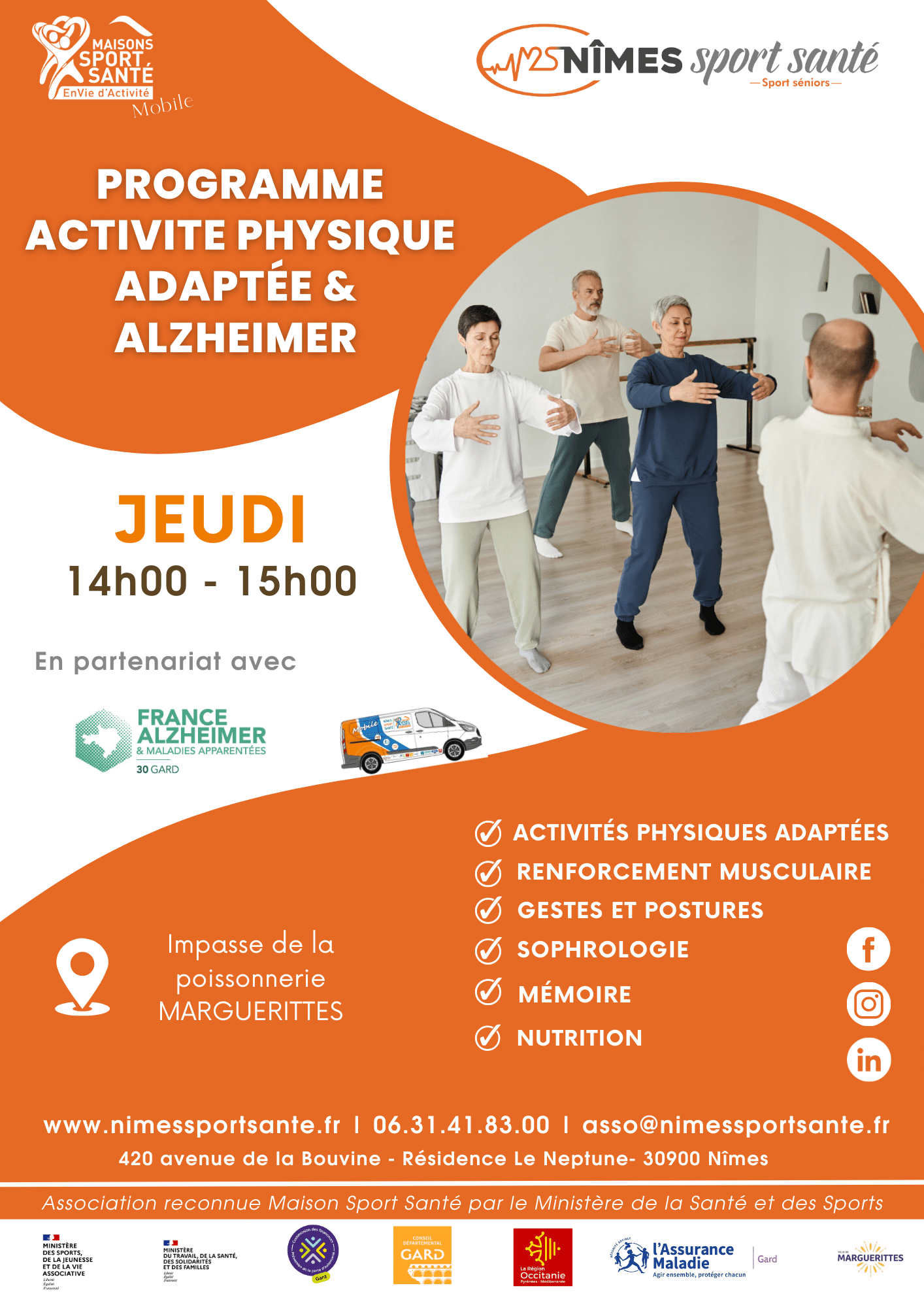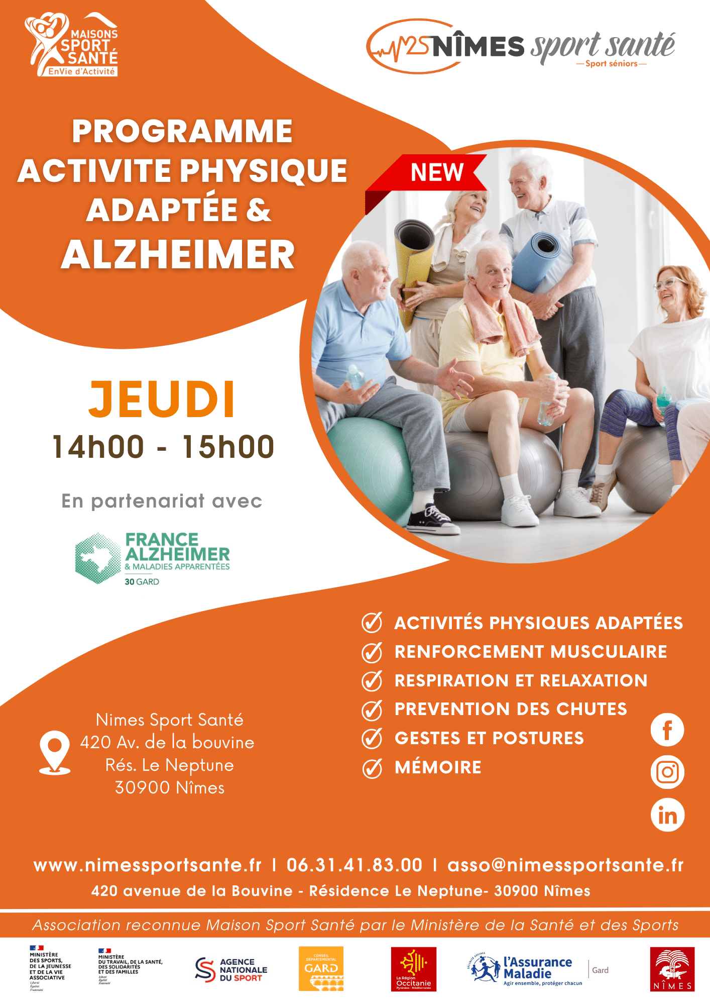 NOUVEAU cette saison, Nîmes Sport Santé en partenariat avec France Alzheimer Gard et avec le soutien financier de la Fondation France Alzheimer met en place un programme en activité physique adaptée (APA) destiné aux seniors atteints de la maladie d’Alzheimer, sur Nîmes.