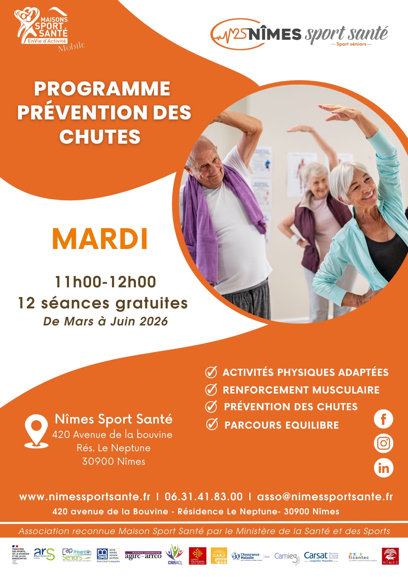En cohérence avec le Plan antichute national, Nîmes Sport Santé propose des programmes annuels (de septembre à juin) d’activités physiques adaptées pour renforcer l’équilibre, prévenir les chutes et maintenir l’autonomie des personnes de plus de 60 ans.