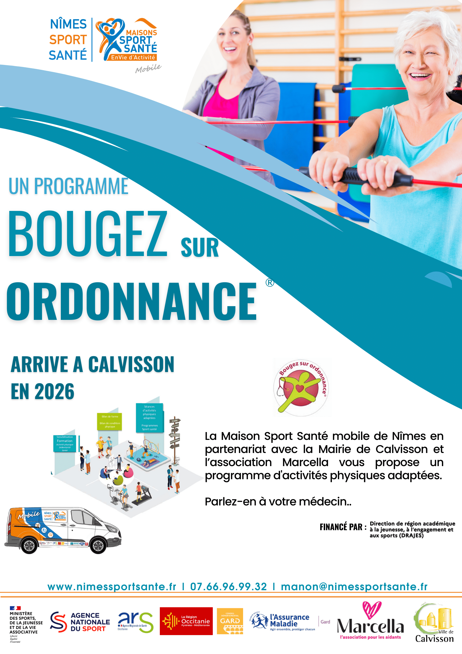 Bougez sur Ordonnance arrive à Calvisson en 2026 grâce à la Maison Sport Santé mobile de Nîmes, en partenariat avec la Ville de Calvisson et l’association Marcella. Ce programme propose un accompagnement en activité physique adaptée, sécurisé et personnalisé, sur prescription médicale. Il s’adresse aux personnes souhaitant améliorer leur santé, leur autonomie et leur qualité de vie par le mouvement.