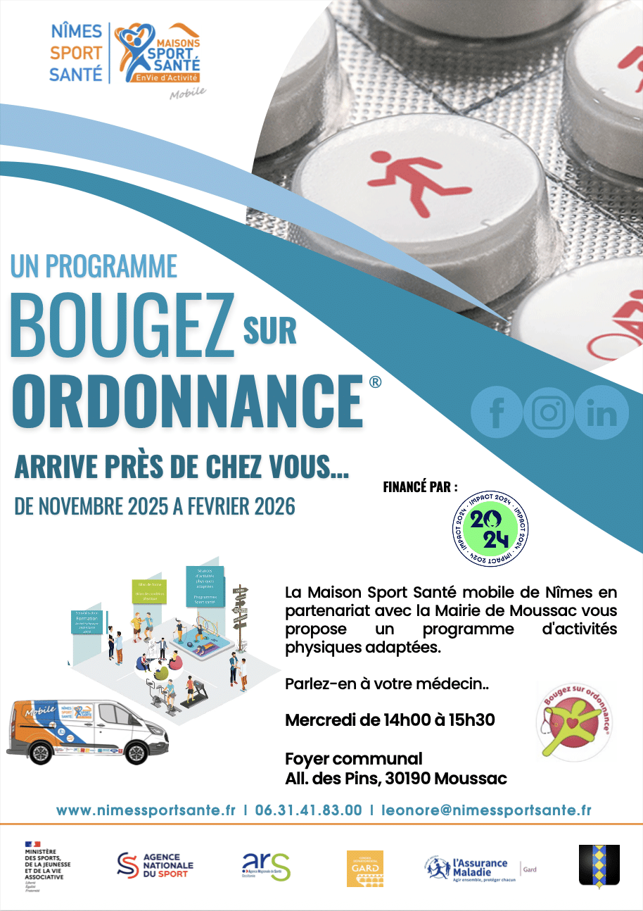 Bougez sur Ordonnance arrive à Moussac en 2026 grâce à la Maison Sport Santé mobile de Nîmes, en partenariat avec la Mairie de Moussac et la MSP de Brignon. Ce programme propose un accompagnement en activité physique adaptée, sécurisé et personnalisé, sur prescription médicale. Il s’adresse aux personnes souhaitant améliorer leur santé, leur autonomie et leur qualité de vie par le mouvement.